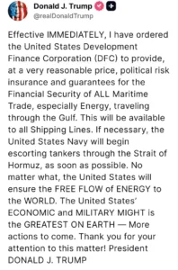 "בכל מקרה, ארה"ב תבטיח את הזרימה החופשית של אנרגיה לעולם. העוצמה הכלכלית והצבאית של ארה"ב היא הגדולה ביותר על פני כדור הארץ – צעדים נוספים יגיעו".